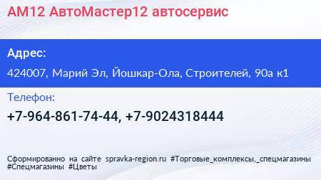 АМ12 АвтоМастер12, автосервис по адресу 424007, Марий Эл, Йошкар-Ола, Строителей, 90а к1 в дальнейшем Организация, размещена в следующих категориях: