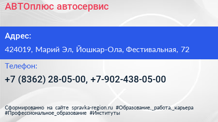 АВТОплюс, автосервис по адресу 424019, Марий Эл, Йошкар-Ола, Фестивальная, 72 в дальнейшем Организация, размещена в следующих категориях: