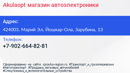 Akulaopt, магазин автоэлектроники по адресу 424003, Марий Эл, Йошкар-Ола, Зарубина, 13 в дальнейшем Организация, размещена в следующих категориях: