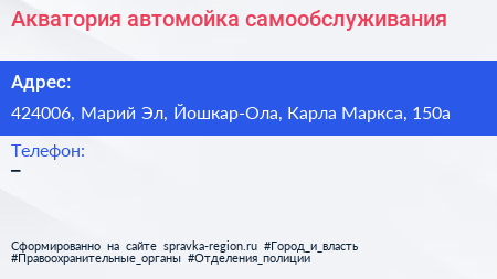 Акватория, автомойка самообслуживания по адресу 424006, Марий Эл, Йошкар-Ола, Карла Маркса, 150а в дальнейшем Организация, размещена в следующих категориях: