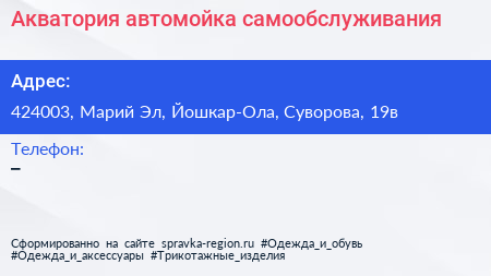 Акватория, автомойка самообслуживания по адресу 424003, Марий Эл, Йошкар-Ола, Суворова, 19в в дальнейшем Организация, размещена в следующих категориях: