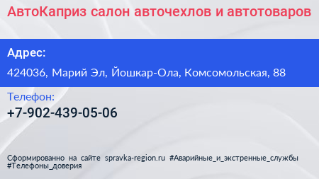 АвтоКаприз, салон авточехлов и автотоваров по адресу 424036, Марий Эл, Йошкар-Ола, Комсомольская, 88 в дальнейшем Организация, размещена в следующих категориях: