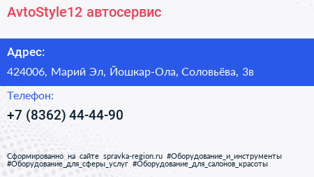 AvtoStyle12, автосервис по адресу 424006, Марий Эл, Йошкар-Ола, Соловьёва, 3в в дальнейшем Организация, размещена в следующих категориях: