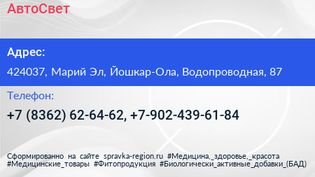 АвтоСвет по адресу 424037, Марий Эл, Йошкар-Ола, Водопроводная, 87 в дальнейшем Организация, размещена в следующих категориях: