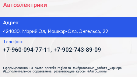 Автоэлектрики по адресу 424030, Марий Эл, Йошкар-Ола, Энгельса, 29 в дальнейшем Организация, размещена в следующих категориях: