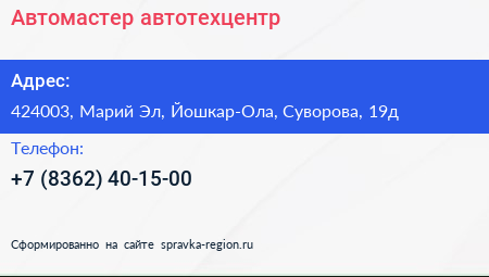 Автомастер, автотехцентр по адресу 424003, Марий Эл, Йошкар-Ола, Суворова, 19д в дальнейшем Организация, размещена в следующих категориях: