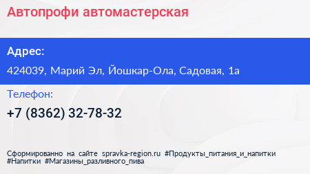 Автопрофи, автомастерская по адресу 424039, Марий Эл, Йошкар-Ола, Садовая, 1а в дальнейшем Организация, размещена в следующих категориях: