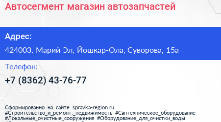 Автосегмент, магазин автозапчастей по адресу 424003, Марий Эл, Йошкар-Ола, Суворова, 15а в дальнейшем Организация, размещена в следующих категориях: