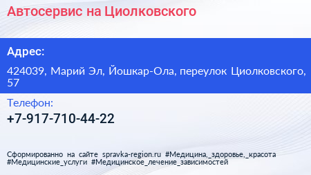 Автосервис на Циолковского по адресу 424039, Марий Эл, Йошкар-Ола, переулок Циолковского, 57 в дальнейшем Организация, размещена в следующих категориях:
