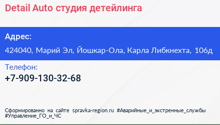 Detail Auto, студия детейлинга по адресу 424040, Марий Эл, Йошкар-Ола, Карла Либкнехта, 106д в дальнейшем Организация, размещена в следующих категориях: