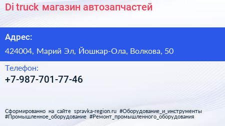 Di truck, магазин автозапчастей по адресу 424004, Марий Эл, Йошкар-Ола, Волкова, 50 в дальнейшем Организация, размещена в следующих категориях: