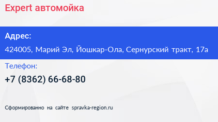 Expert, автомойка по адресу 424005, Марий Эл, Йошкар-Ола, Сернурский тракт, 17а в дальнейшем Организация, размещена в следующих категориях: