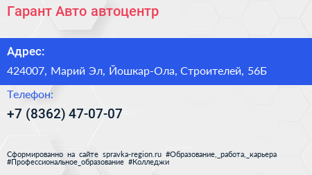 Гарант Авто, автоцентр по адресу 424007, Марий Эл, Йошкар-Ола, Строителей, 56Б в дальнейшем Организация, размещена в следующих категориях: