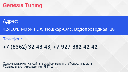 Genesis Tuning по адресу 424004, Марий Эл, Йошкар-Ола, Водопроводная, 28 в дальнейшем Организация, размещена в следующих категориях: