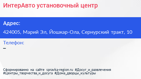 ИнтерАвто, установочный центр по адресу 424005, Марий Эл, Йошкар-Ола, Сернурский тракт, 10 в дальнейшем Организация, размещена в следующих категориях: