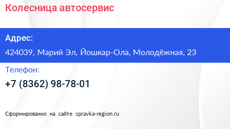 Колесница, автосервис по адресу 424039, Марий Эл, Йошкар-Ола, Молодёжная, 23 в дальнейшем Организация, размещена в следующих категориях: