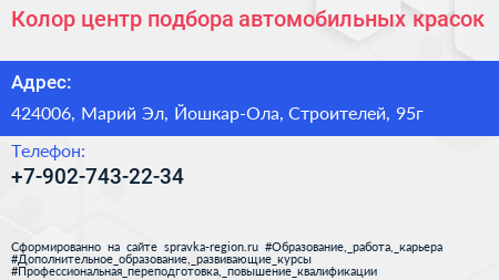 Колор, центр подбора автомобильных красок по адресу 424006, Марий Эл, Йошкар-Ола, Строителей, 95г в дальнейшем Организация, размещена в следующих категориях: