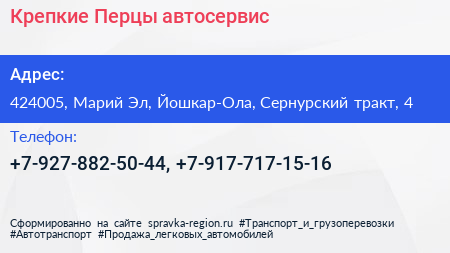 Крепкие Перцы, автосервис по адресу 424005, Марий Эл, Йошкар-Ола, Сернурский тракт, 4 в дальнейшем Организация, размещена в следующих категориях: