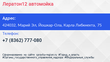 Лератон12, автомойка по адресу 424032, Марий Эл, Йошкар-Ола, Карла Либкнехта, 75 в дальнейшем Организация, размещена в следующих категориях: