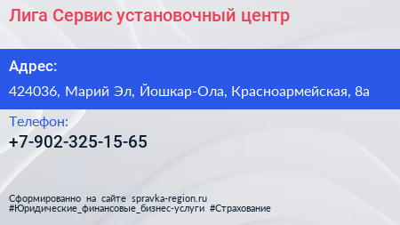 Лига-Сервис, установочный центр по адресу 424036, Марий Эл, Йошкар-Ола, Красноармейская, 8а в дальнейшем Организация, размещена в следующих категориях: