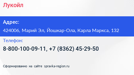 Лукойл по адресу 424006, Марий Эл, Йошкар-Ола, Карла Маркса, 132 в дальнейшем Организация, размещена в следующих категориях: