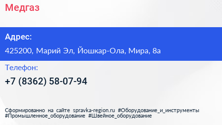 Медгаз по адресу 425200, Марий Эл, Йошкар-Ола, Мира, 8а в дальнейшем Организация, размещена в следующих категориях: