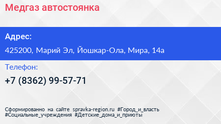 Медгаз, автостоянка по адресу 425200, Марий Эл, Йошкар-Ола, Мира, 14а в дальнейшем Организация, размещена в следующих категориях: