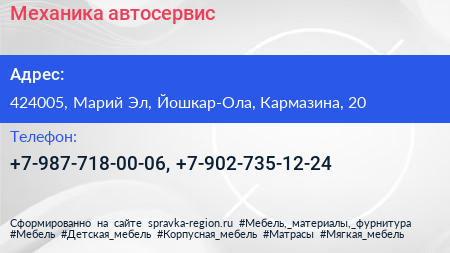 Механика, автосервис по адресу 424005, Марий Эл, Йошкар-Ола, Кармазина, 20 в дальнейшем Организация, размещена в следующих категориях: