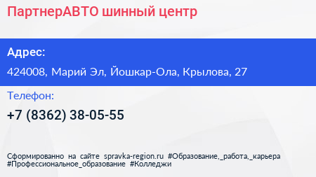 ПартнерАВТО, шинный центр по адресу 424008, Марий Эл, Йошкар-Ола, Крылова, 27 в дальнейшем Организация, размещена в следующих категориях: