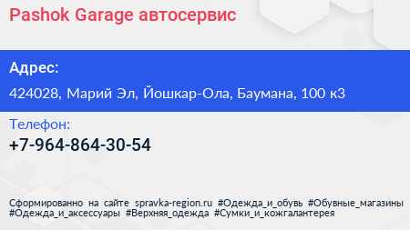 Pashok Garage, автосервис по адресу 424028, Марий Эл, Йошкар-Ола, Баумана, 100 к3 в дальнейшем Организация, размещена в следующих категориях: