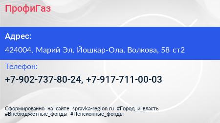 ПрофиГаз по адресу 424004, Марий Эл, Йошкар-Ола, Волкова, 58 ст2 в дальнейшем Организация, размещена в следующих категориях: