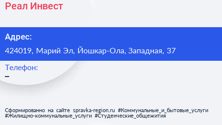 Реал-Инвест по адресу 424019, Марий Эл, Йошкар-Ола, Западная, 37 в дальнейшем Организация, размещена в следующих категориях: