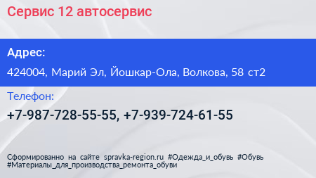 Сервис 12, автосервис по адресу 424004, Марий Эл, Йошкар-Ола, Волкова, 58 ст2 в дальнейшем Организация, размещена в следующих категориях: