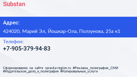 Substan по адресу 424020, Марий Эл, Йошкар-Ола, Ползунова, 25а к1 в дальнейшем Организация, размещена в следующих категориях: