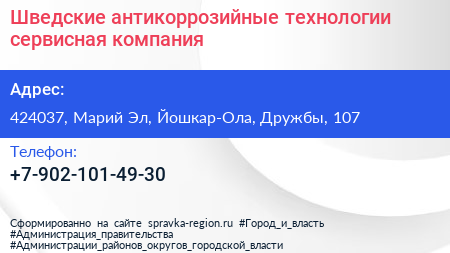 Шведские антикоррозийные технологии, сервисная компания по адресу 424037, Марий Эл, Йошкар-Ола, Дружбы, 107 в дальнейшем Организация, размещена в следующих категориях: