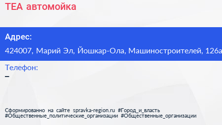 ТЕА, автомойка по адресу 424007, Марий Эл, Йошкар-Ола, Машиностроителей, 126а в дальнейшем Организация, размещена в следующих категориях: