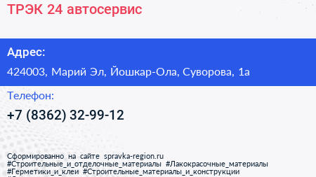 ТРЭК-24, автосервис по адресу 424003, Марий Эл, Йошкар-Ола, Суворова, 1а в дальнейшем Организация, размещена в следующих категориях: