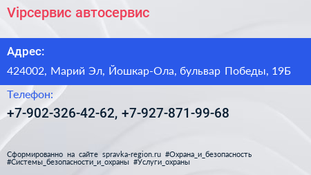 Vipсервис, автосервис по адресу 424002, Марий Эл, Йошкар-Ола, бульвар Победы, 19Б в дальнейшем Организация, размещена в следующих категориях: