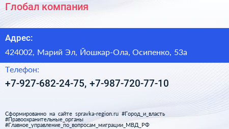 Глобал, компания по адресу 424002, Марий Эл, Йошкар-Ола, Осипенко, 53а в дальнейшем Организация, размещена в следующих категориях:
