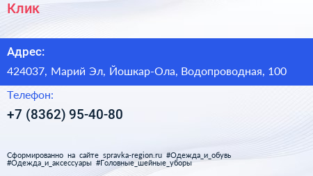 Клик по адресу 424037, Марий Эл, Йошкар-Ола, Водопроводная, 100 в дальнейшем Организация, размещена в следующих категориях: