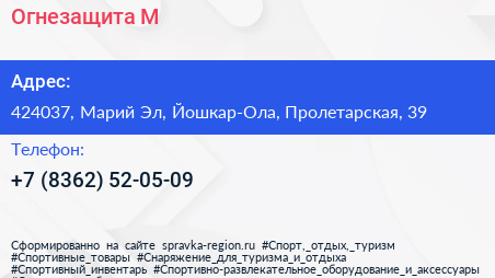 Огнезащита М по адресу 424037, Марий Эл, Йошкар-Ола, Пролетарская, 39 в дальнейшем Организация, размещена в следующих категориях: