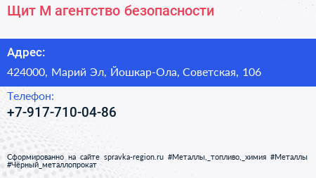 Щит-М, агентство безопасности по адресу 424000, Марий Эл, Йошкар-Ола, Советская, 106 в дальнейшем Организация, размещена в следующих категориях: