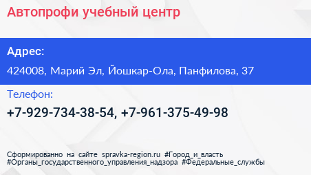 Автопрофи, учебный центр по адресу 424008, Марий Эл, Йошкар-Ола, Панфилова, 37 в дальнейшем Организация, размещена в следующих категориях: