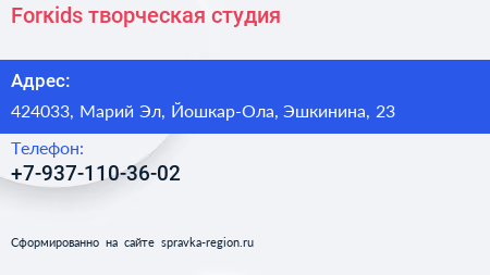 Forкids, творческая студия по адресу 424033, Марий Эл, Йошкар-Ола, Эшкинина, 23 в дальнейшем Организация, размещена в следующих категориях: