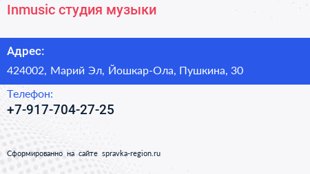 Inmusic, cтудия музыки по адресу 424002, Марий Эл, Йошкар-Ола, Пушкина, 30 в дальнейшем Организация, размещена в следующих категориях:
