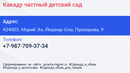 Какаду, частный детский сад по адресу 424003, Марий Эл, Йошкар-Ола, Прохорова, 9 в дальнейшем Организация, размещена в следующих категориях: