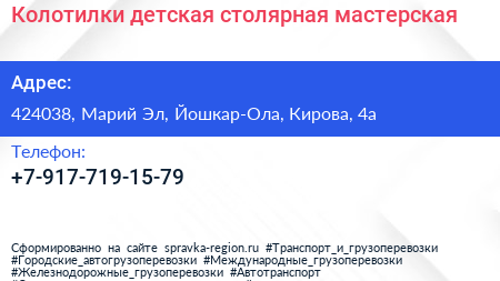 Колотилки, детская столярная мастерская по адресу 424038, Марий Эл, Йошкар-Ола, Кирова, 4а в дальнейшем Организация, размещена в следующих категориях: