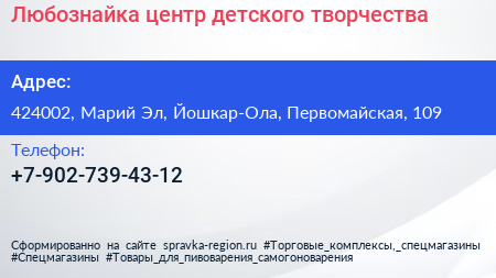 Любознайка, центр детского творчества по адресу 424002, Марий Эл, Йошкар-Ола, Первомайская, 109 в дальнейшем Организация, размещена в следующих категориях: