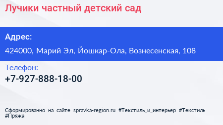 Лучики, частный детский сад по адресу 424000, Марий Эл, Йошкар-Ола, Вознесенская, 108 в дальнейшем Организация, размещена в следующих категориях: