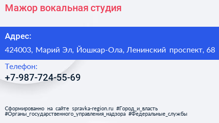 Мажор, вокальная студия по адресу 424003, Марий Эл, Йошкар-Ола, Ленинский проспект, 68 в дальнейшем Организация, размещена в следующих категориях: